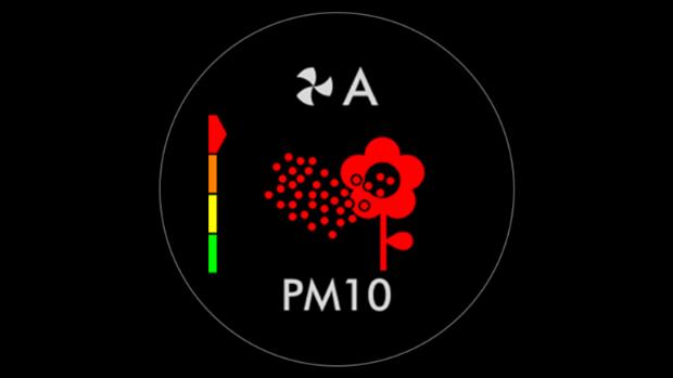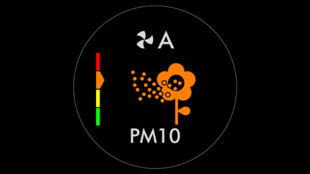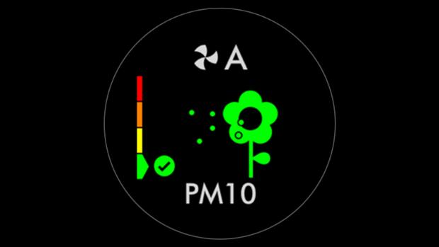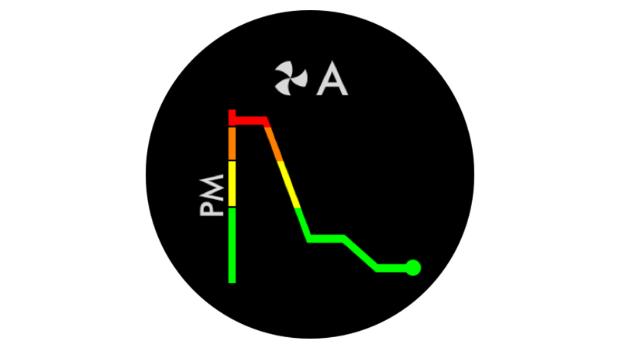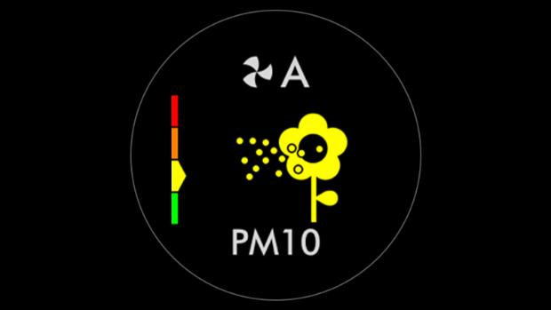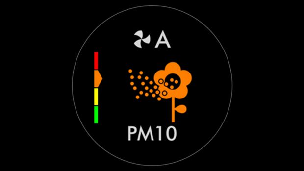 When a pollutant reduces your air quality, its icon appears on screen. In this case, PM10. This coloured bar on the left indicates how much of the pollutant is present, and will continually update as the machine purifies your air.